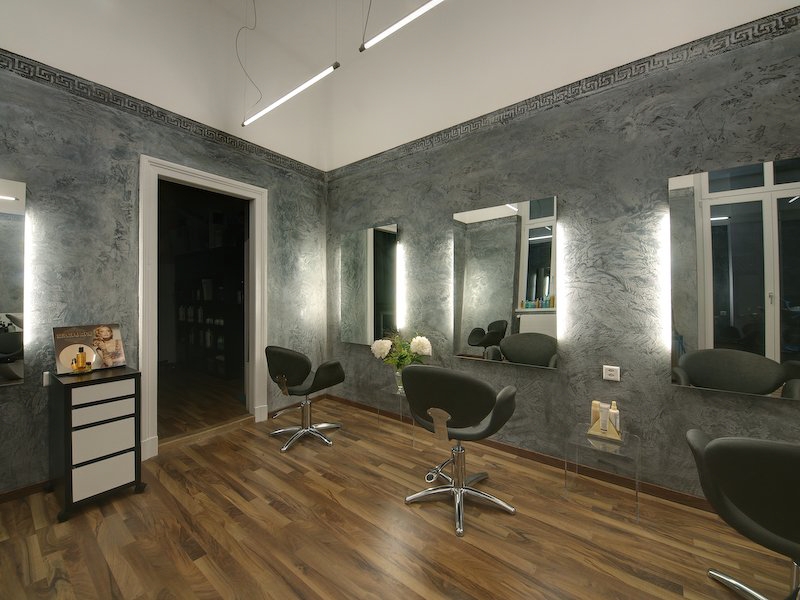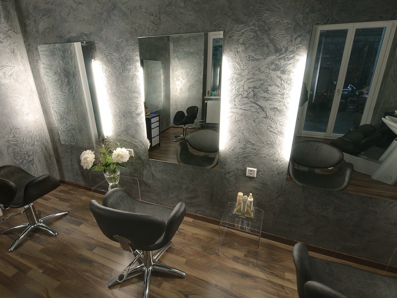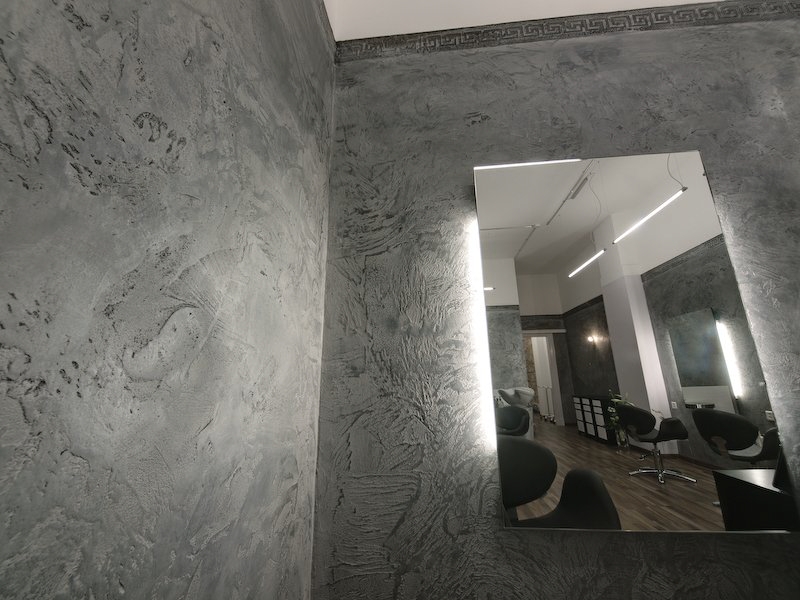 Friseursalon, Trendladen, Modegeschäft … was liegt da näher, als die neue Wandgestaltung genau in diese Richtung zu bringen. Eine kreativ gestaltete Kalkmarmorputzgestaltung in einem mittleren Grauton und unregelmäßigen Strukturen. Klare, teils tiefe Einschläge an der Oberfläche sind erkennbar.