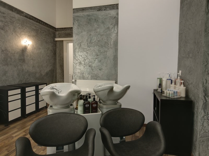 Der obere Wandanschluss –deutlich unterhalb der Decke- wird durch eine stilgerechte Prägeborte hervorgehoben. Eine Inszenierung durch das indirekte Licht setzt diese Gestaltung noch mehr und vor allem geschickt in Szene. Alles für das Auge des Betrachters, den Friseurkunden. Der hat nämlich während der Verschönerung seiner Haarpracht in diesem Raum genügend Zeit, sich in dieser Stimmung umzusehen.