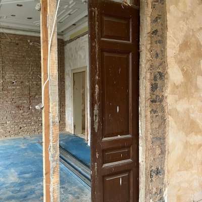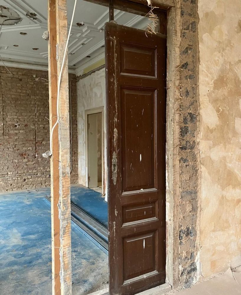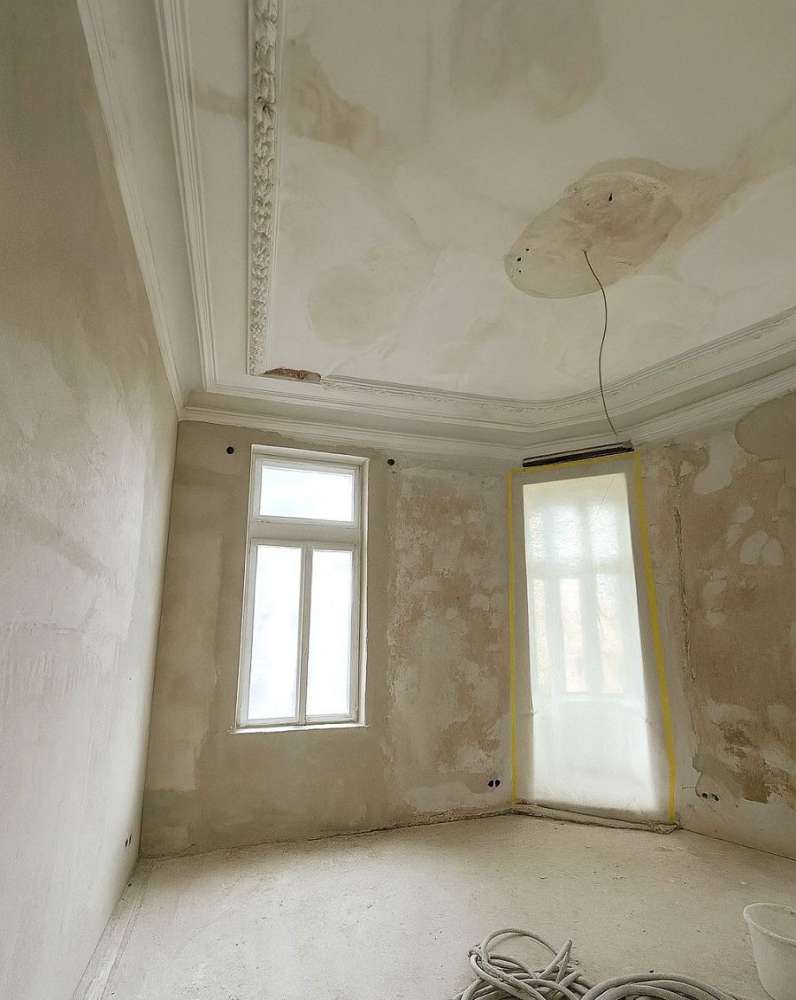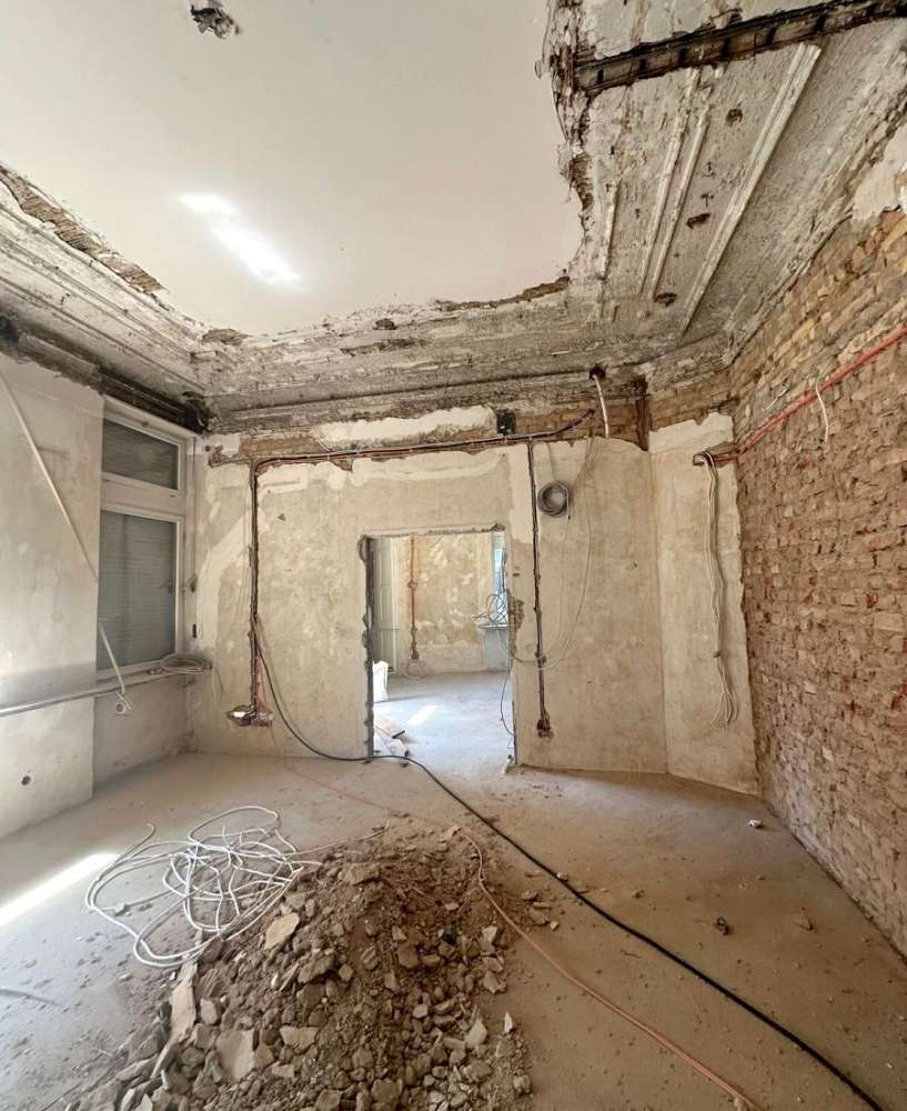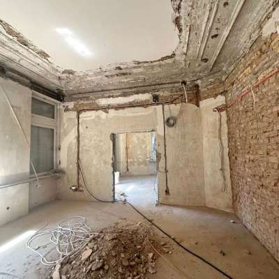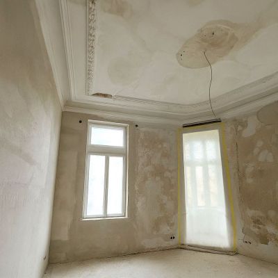 Die Bilder der Sanierungsphase zeigen eindrucksvoll den Weg von der rohen Baustelle bis zur fertiggestellten Wohnung: freigelegte Ziegelwände, beschädigte Decken und alte Installationen wurden Schritt für Schritt in hochwertige Wohnräume verwandelt. Besonders beeindruckend ist das Zusammenspiel aus restaurierten Stuckdecken, klassischem Parkett und den neu gestalteten Wandflächen.