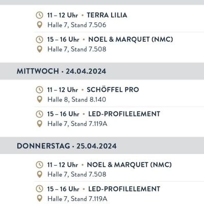 Allerbesten Dank an unsere auf der FAF 2024 ausstellenden MW-Produktpartner Terra Lilia, Noel & Marquet, Schöffel PRO und LED-Profilelement für die zur Verfügungstellung Ihrer Messestände für unsere jeweils 1-stündigen MW-Jubiläumstalkshows.