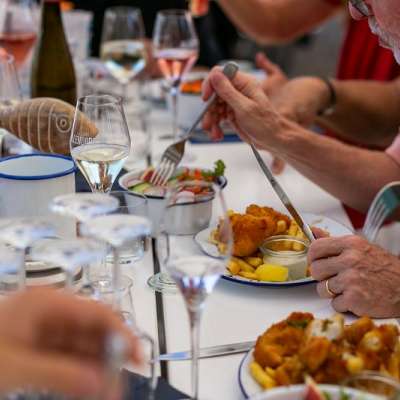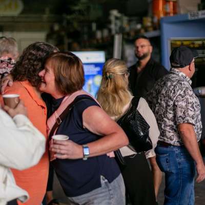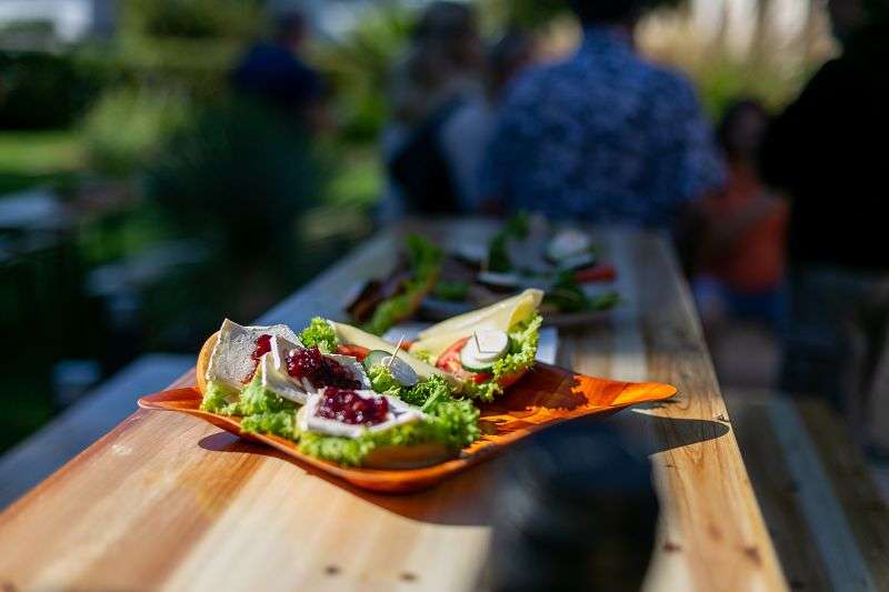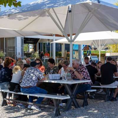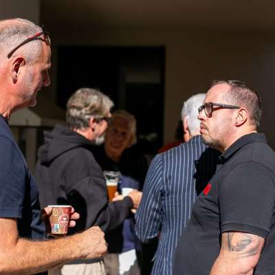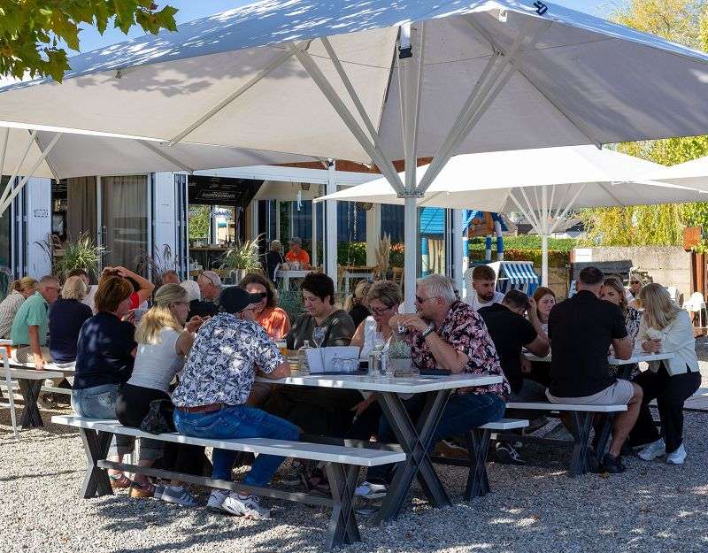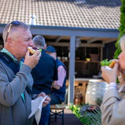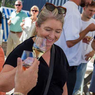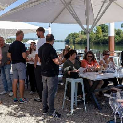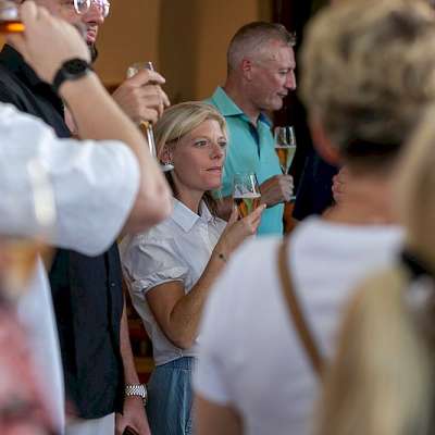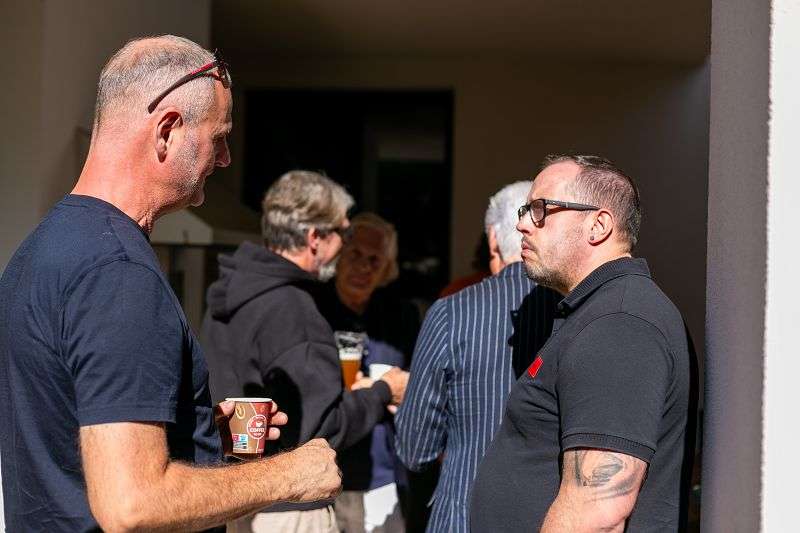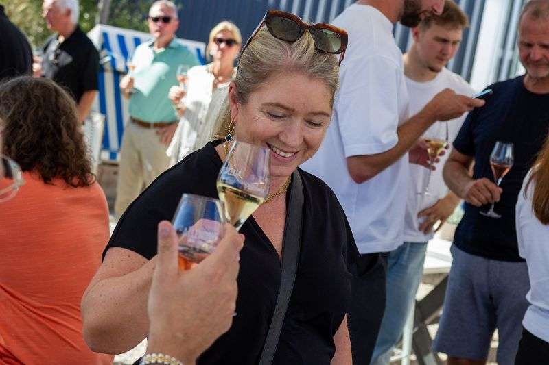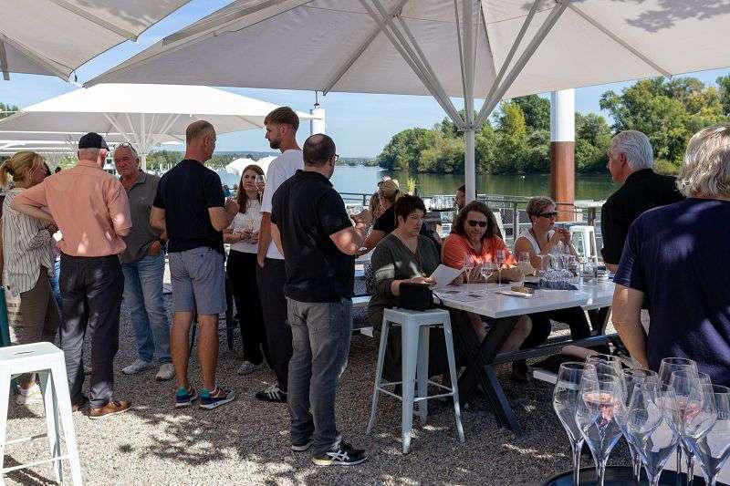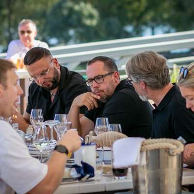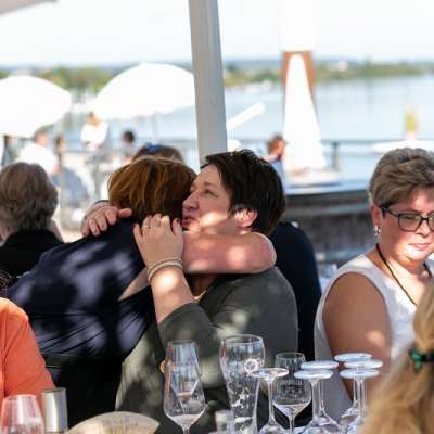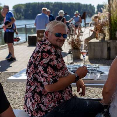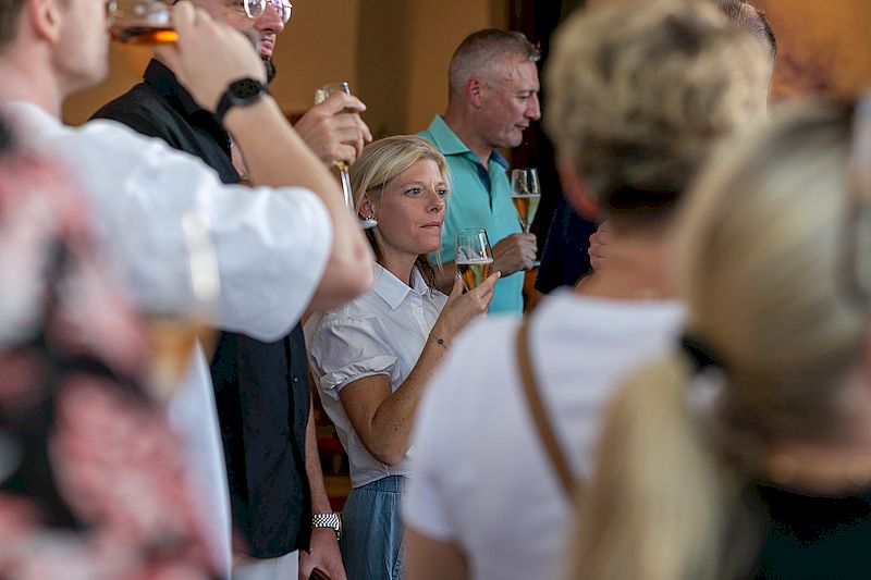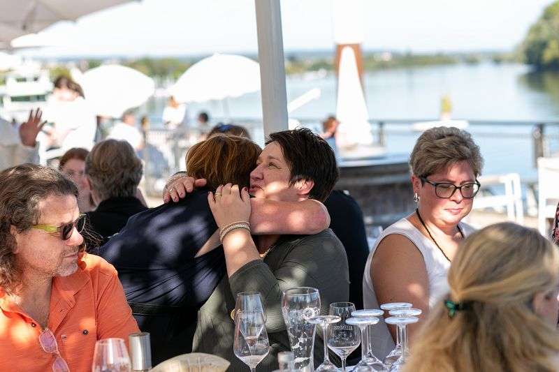 Von dort ging es weiter zur alten Kiesverladestelle „Allendorf am Rhein“, wo in stimmungsvoller Atmosphäre, fast wie in einer Sylter Strandkulisse, ein Sektumtrunk mit Snacks und intensiven Netzwerk-Gesprächen stattfand. Der Blick über den Rhein, das Licht der Mittagssonne und die entspannte Stimmung boten einen wunderbaren Kontrast zum intensiven Arbeitsteil des Tages.