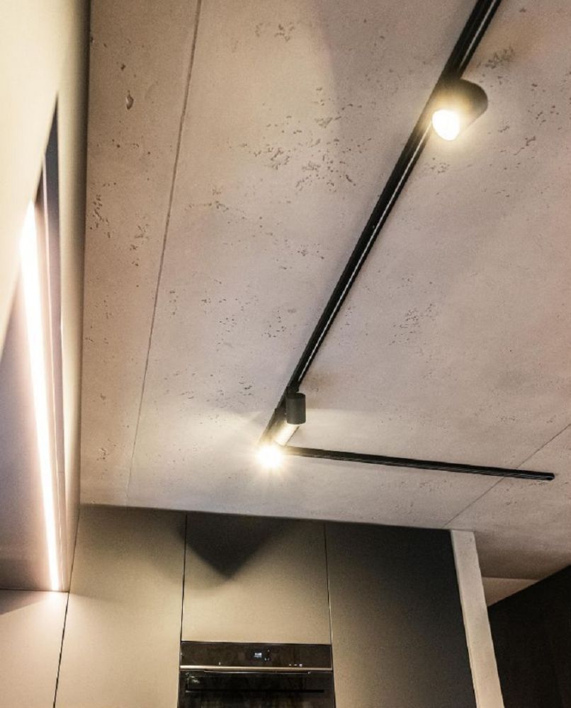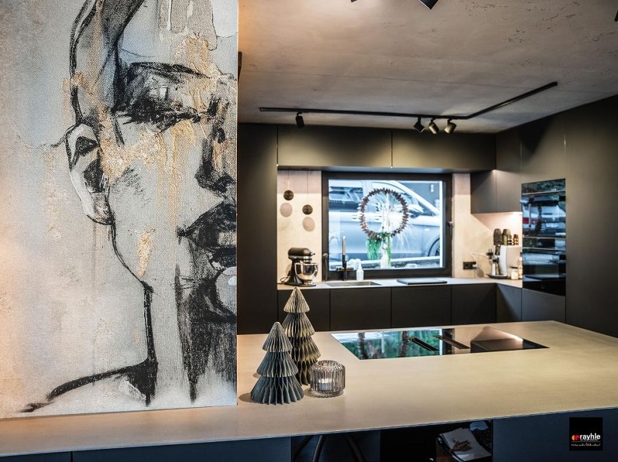 Die Decke sowie einige Wandscheiben wurden mit hochwertiger Sichtbetonoptik in Schalungstechnik ausgebildet. Diese Gestaltung sorgt für einen authentischen, industriellen Look, der perfekt zur modernen Gestaltung der Küche passt. Die Kombination aus dunklen Küchenschränken und der Betonstruktur schafft einen stilvollen Kontrast und unterstreicht die urban-moderne Gestaltung.