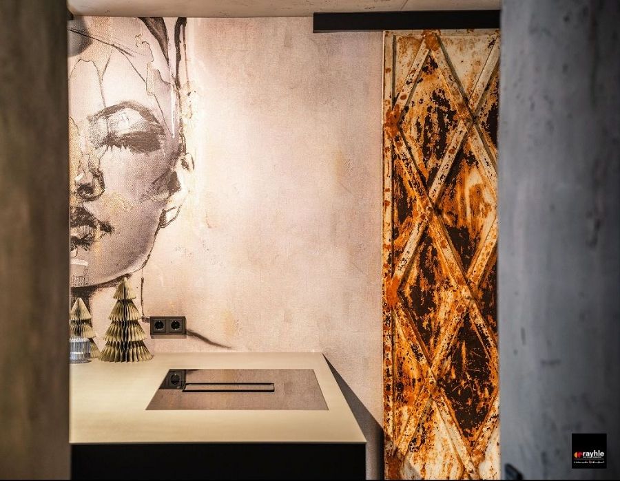 Eine Wand wurde mit der Designtapete "Miss Grey" gestaltet. Diese moderne Akzentwand setzt einen künstlerischen Fokus und sorgt für ein individuelles Flair. Die Kombination aus Betonoptik und der kunstvollen Darstellung verleiht dem Raum Tiefe und Charakter. Ein weiteres gestalterisches Highlight ist die Schiebetür im Rostlook. Sie verleiht der Küche nicht nur einen urbanen Charme, sondern ist auch ein funktionales Designelement, das sich harmonisch in das Gesamtkonzept einfügt.