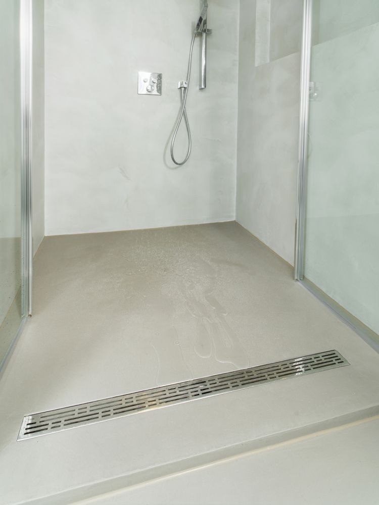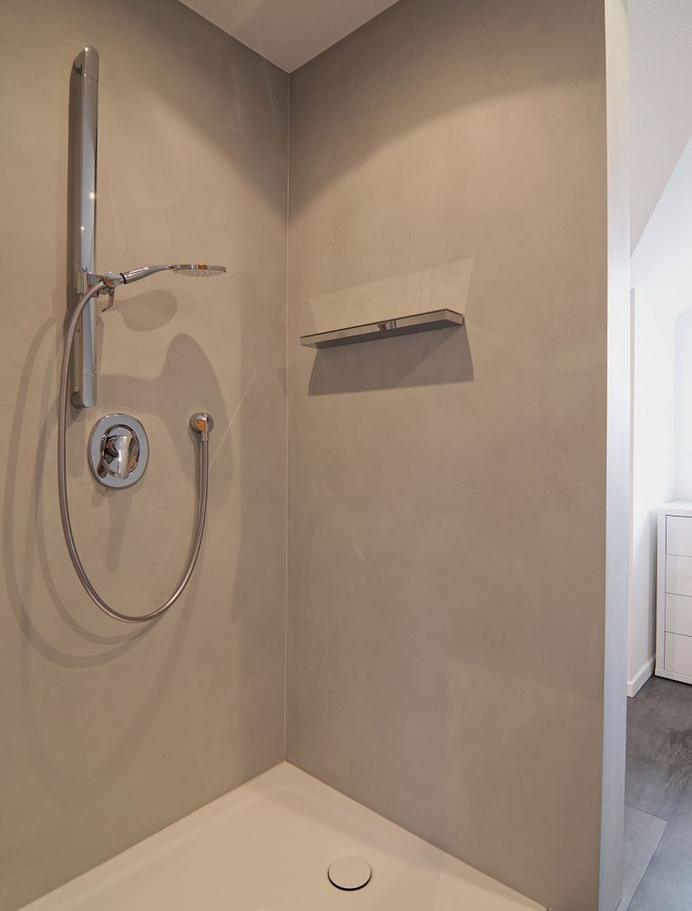 Ein besonders beliebter Bereich für die fugenlose Gestaltung ist die Dusche. Fugenlos gespachtelte Duschwände und Duschböden bieten nicht nur eine edle Optik, sondern auch funktionale Vorteile. Die Ein- und Anarbeitung eines Bodeneinlaufs für das Duschwasser erfordert jedoch handwerkliches Geschick und Erfahrung. Der Ablauf muss nahtlos integriert, angearbeitet und abgedichtet werden, um eine einwandfreie Entwässerung zu gewährleisten und Wasserstau oder gar Wassereindringung ins Mauerwerk durch undichte Stellen zu verhindern. Dies alles erfordert langjährige Erfahrung, präzises Arbeiten und eine genaue Planung im Vorfeld.