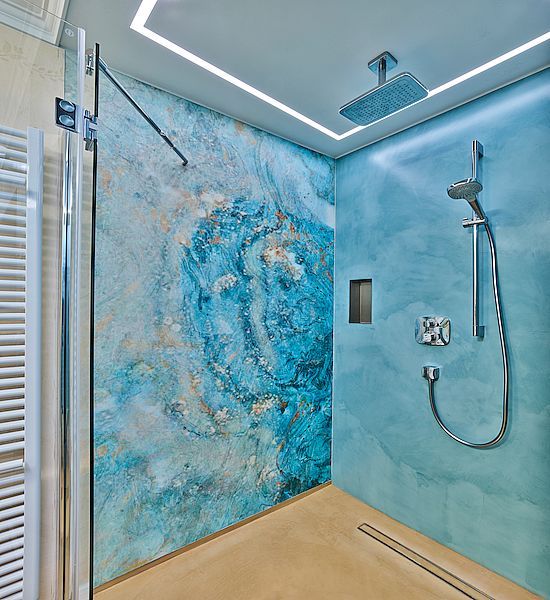 Unsere Marmorputze ermöglichen neue Wandgestaltungsvarianten für Bäder. Chic und doch irgendwie schlicht und ruhig wirken die homogenen Wände auf den Betrachter. Baddesign anders. Keine optisch störenden Fugen, eine ganz besondere Haptik und die Farbenvielfalt an Möglichkeiten zeichnen unsere Marmorputz-Wandflächen hier aus. Ein Badezimmer ohne Fliesen. Mit unserer speziellen Versiegelung sind diese Flächen zu 100% Wasser abweisend und somit auch in direkten Duschbereichen einsetzbar.